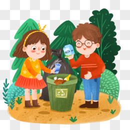 手绘卡通男孩女孩丢垃圾进垃圾桶插画免抠元素