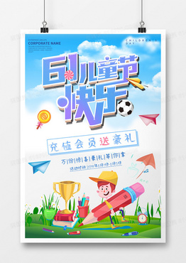 浅蓝色书本读书孩子铅笔草丛学习简约风欢乐六一儿童节海报