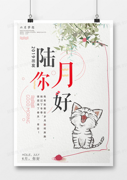 扁平蓝色创意简约树小猫小清新风格卡通商务宣传六月你好海报
