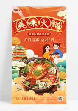 手绘国潮风麻辣海鲜蔬菜火锅餐厅类可通用海报