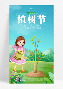 浅蓝色插画风312植树节浇树保护环境手机UI宣传海报