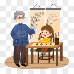手绘卡通爷爷教女孩写毛笔字免抠元素