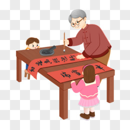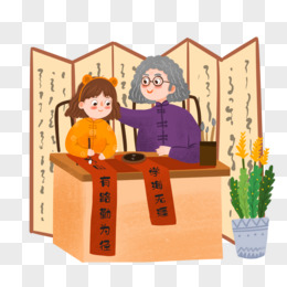 手绘卡通老人教孩子写毛笔字插画免抠元素