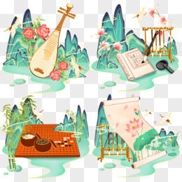 一组手绘琴棋书画合集插画元素