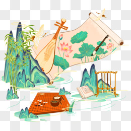 一组手绘国潮风琴棋书画山水组合合集之画卷元素
