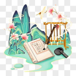 一组手绘国潮风琴棋书画山水组合合集之弹琴元素