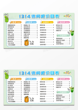绿色 卡通 1314休闲吧价目表 饮品价目 热饮 水果茶果汁价格表