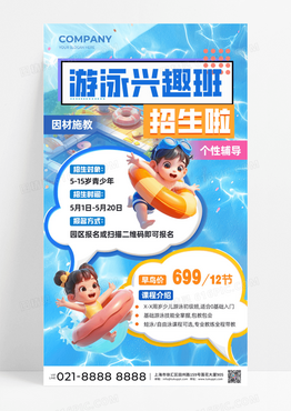 蓝色看他游泳兴趣班教育培训优惠活动手机宣传海报