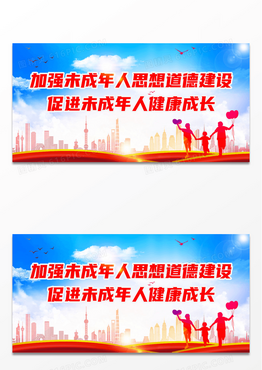 蓝色渐变清新城市剪影加强未成年人思想道德展板