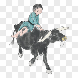 手绘水彩放牛娃骑牛元素