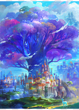 水彩紫色大树城堡