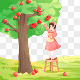 手绘小女孩摘苹果素材
