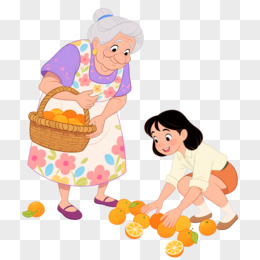 卡通手绘女孩帮老人捡起水果免抠元素