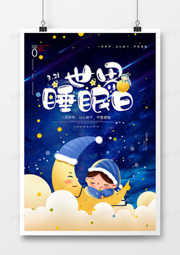 简约蓝色晚安世界睡眠日插画风海报