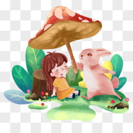 手绘儿插风女孩睡觉童话兔子打蘑菇伞素材