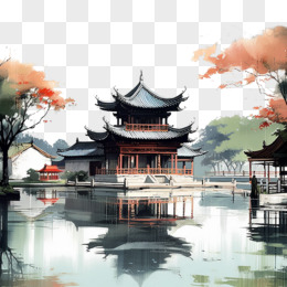 国风水墨亭台楼阁古代建筑元素