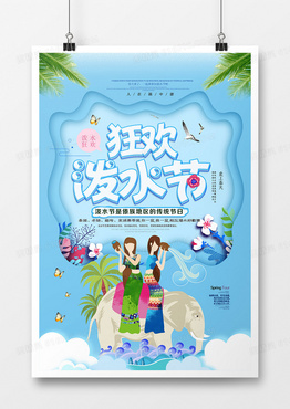 创意剪纸风小清新卡通时尚泼水节海报模板