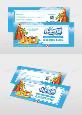 蓝色手绘卡通水上乐园玩耍大气简约时尚游乐场水上乐园体验券设计模板