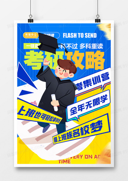 蓝黄手绘卡通上岸考研攻略海报