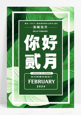 春天绿色森林系风格树叶繁茂你好二月唯美浪漫宣传海报设计