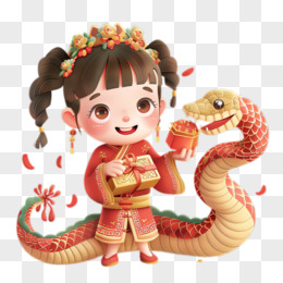 中国春节卡通女孩抱着宝箱蛇年新年元素