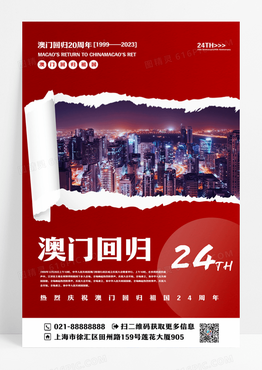 红色大气纸张撕开创意澳门回归纪念日海报设计