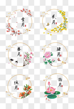 一组手绘中式水彩植物系列月份标题套图系列一素材