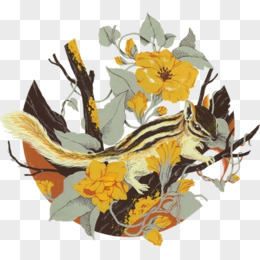 手绘风格的可爱松鼠狗用鼻子闻盛开的花朵的免抠元素