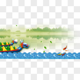 湖边龙舟粽子鲤鱼手绘浪花素彩网