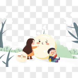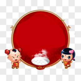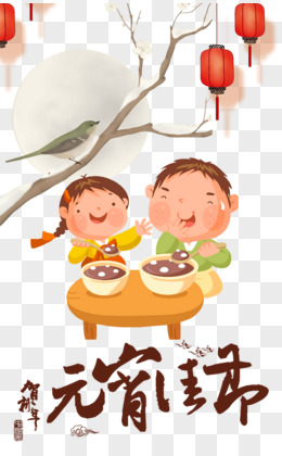 手绘卡通元宵节小牛和儿童吃元宵场景素材