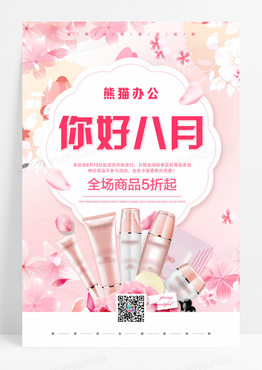 粉色唯美八月你好化妆品夏季促销海报