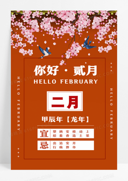 朱红色围墙浪漫桃花燕子春天甲辰年龙年你好二2月宣传海报