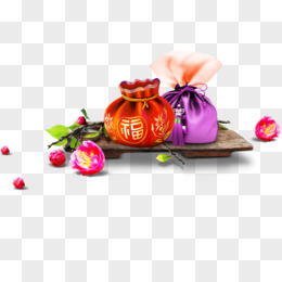 高清摄影创意元素红色紫色钱袋红色桃花