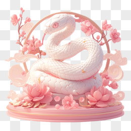 3D卡通新年装饰元素白色蛇和粉色桃花免抠元素