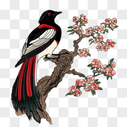 国潮黑红色鸟停在桃花树枝免抠元素