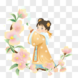手绘桃花人物互动场景插画元素