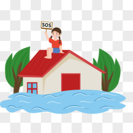 手绘洪灾暴雨屋顶求救的小女孩免抠元素