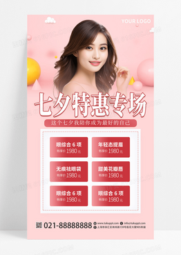 粉红色大气简约美容美肤AI摄影图七夕特惠专场活动宣传手海报