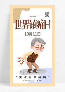 黄色卡通世界镇痛日关注肩颈疼痛手机海报