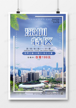 蓝色天空城市绿叶远山现代都市风景简约风深圳旅游海报