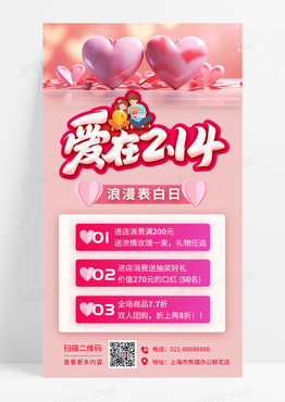 粉色浪漫心形情侣插画214情人节甜蜜告白季活动手机海报