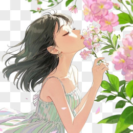 卡通风格中长发穿着粉绿色条纹吊带长裙的美女在粉色的花丛中闻花香免抠元素