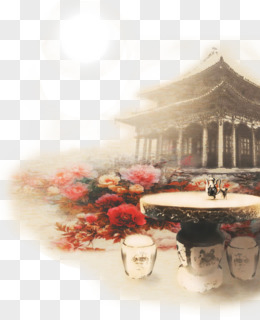 国潮牡丹假山中式建筑手绘免抠元素