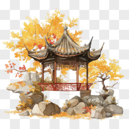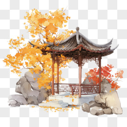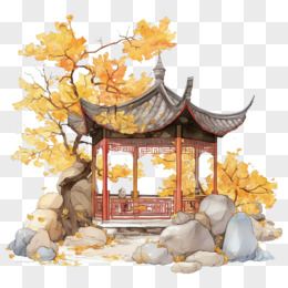 手绘插画国潮亭子风景免抠元素