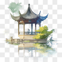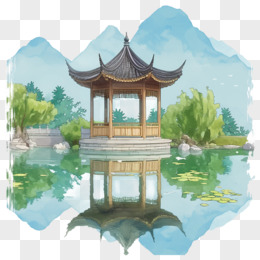 手绘水彩风中式亭子免抠元素