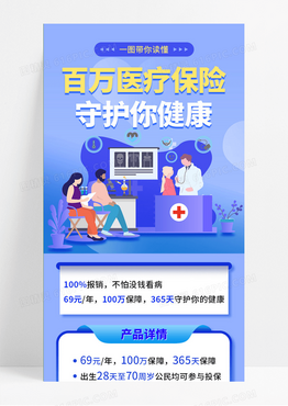 蓝色卡通简约百万医疗健康保险长图