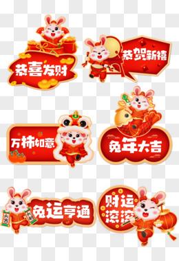 一组手绘免抠新年贴纸套图之兔年新年快乐素材