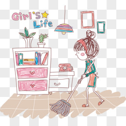 卡通妈妈擦玻璃小女孩拖地爸爸擦桌子免抠元素