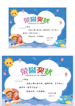 蓝色清新涂鸦可爱卡通幼儿园儿童荣誉证书奖状
