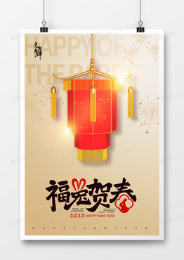 福兔贺春大气金色质感C4D红色立体灯笼春节新年宣传海报